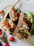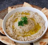 Smoked eggplant mixed with tahini, garlic and olive oil.