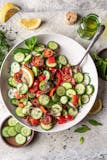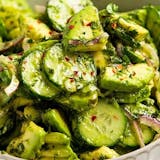 "Chopped cucumber, tomato, red onion, corn, feta cheese, fresh mint and mixed with lemon vinaigrette dressing."