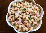 White beans mixed with fresh chopped onion, mint, tomato, pepper, dry mint, salt, black pepper, sumac, olive oil and mixed with lemon vinaigrette dressing.