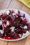 "Chopped red beets mixed with arugula, red onions, almonds, feta cheese and mixed with lemon vinaigrette dressing."