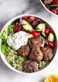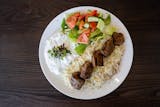 1 Lamb meatball, 3 grilled chicken cubes, 3 grilled lamb cubes, 1 ground lamb meat, 1 lamb chop OR lamb and beef gyro served with white basmati rice, house salad, yogurt sauce and hot sauce on the side.