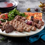 Five tender grilled cubes of lamb marinated with tomato paste, pepper paste, yogurt, corn oil, salt, black pepper and dry oregano served with white basmati rice, house salad, yogurt sauce and hot sauce on the side.