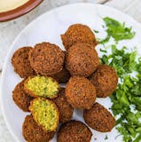 Five lightly fried falafels mixed with chickpea, cilantro, onion, black pepper, salt, vegetable powder, falafel spice and served with tahini, hot sauce and hummus on the side.