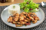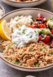 Ground lamb and beef mixed with onion, cumin, black pepper and salt vertically grilled and sliced very thin, served with white basmati rice, house salad, yogurt sauce and hot sauce on the side.